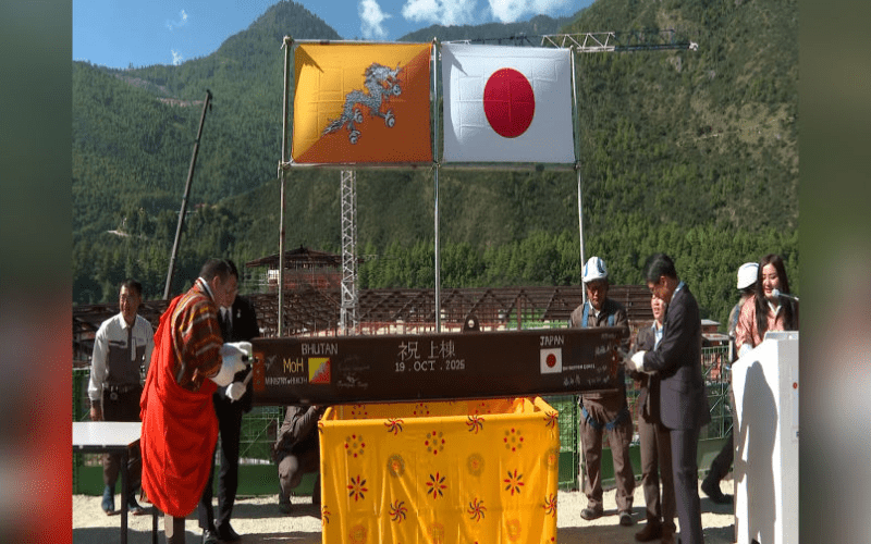 The serene hills of Gidakom echoed with celebration today as the Royal Centre for Infectious Diseases (RCID) reached a major construction milestone. A traditional Japanese topping-out ceremony was held to mark the placement of the final beam atop the structure — a ritual symbolizing good fortune, gratitude, and prayers for the continued safety of the workers.